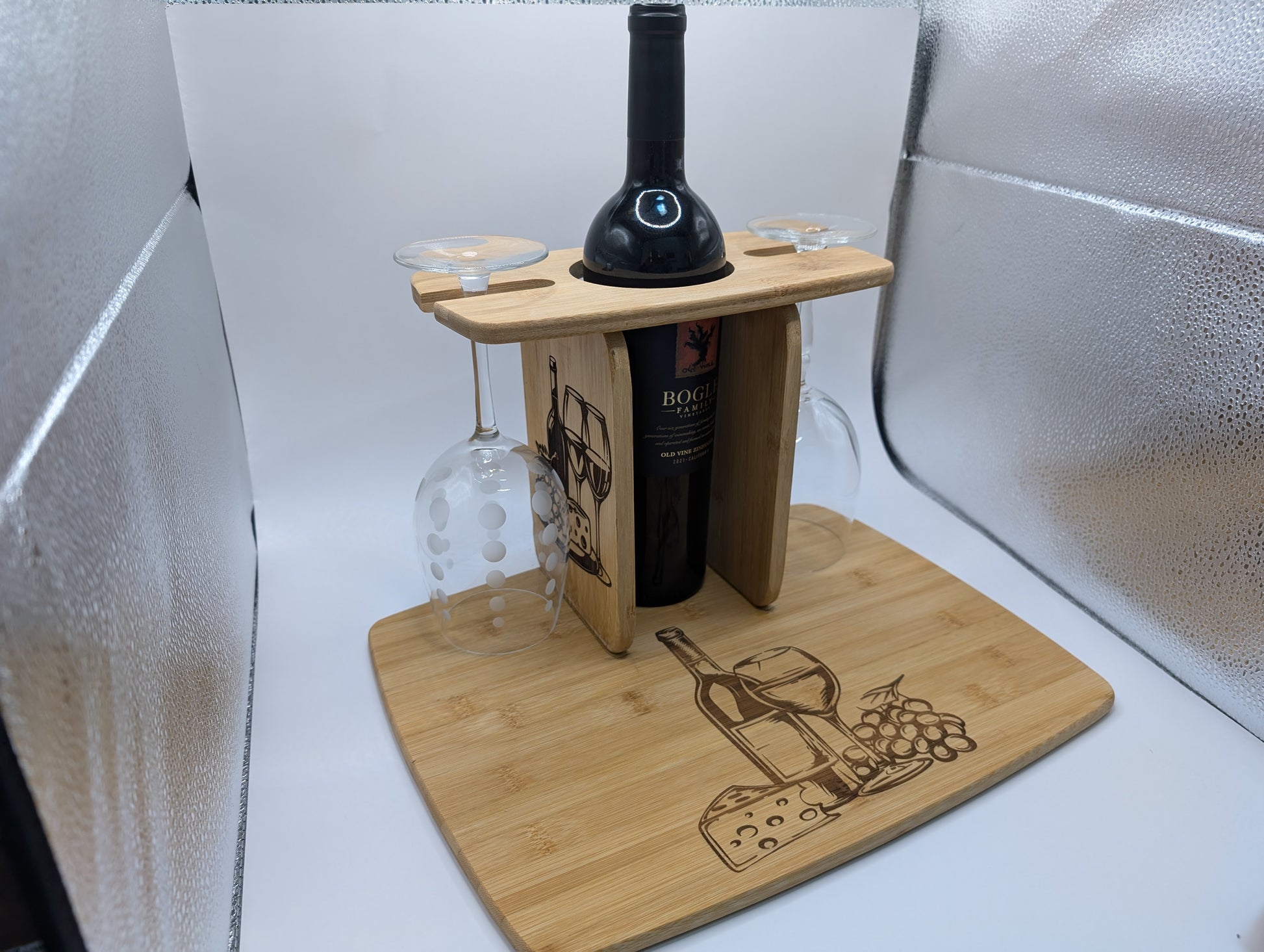 holds 2 wine glasses, a bottle of wine and plenty of cheese / meats etc to have infront of a fire place.